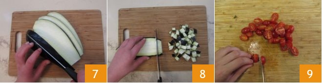 Lavez les aubergines, coupez-les d'abord en tranches 7 puis en morceaux 8. Lavez également les tomates cerises et coupez-les en morceaux 9.