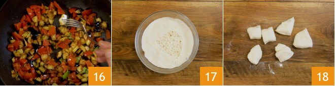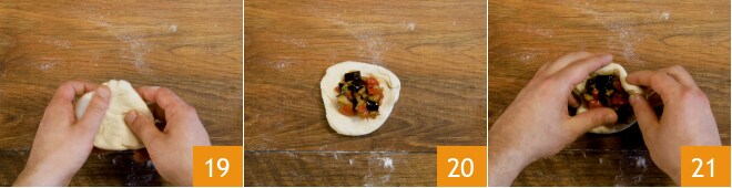 Aplatissez chaque portion avec les mains pour lui donner une forme circulaire 19 et garnissez-la avec environ 2 cuillères à soupe de garniture maintenant froide 20. Refermez bien en soulevant les bords de la pâte et en les pinçant vers le centre 21.