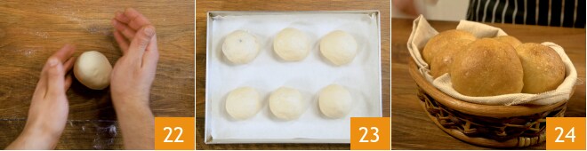 Éliminez l'ail et éteignez le feu 16. Laissez le mélange à température ambiante. Une fois la levée terminée 17, retournez la pâte sur un plan de travail et divisez-la en 6 morceaux de 70 grammes 18.