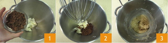 Pour réaliser les petits biscuits au cacao sans œufs, mettez dans un batteur équipé d'un fouet le beurre à température ambiante et le sucre muscovado 1. Allumez la machine 2 et faites fonctionner jusqu'à obtenir un mélange homogène 3.