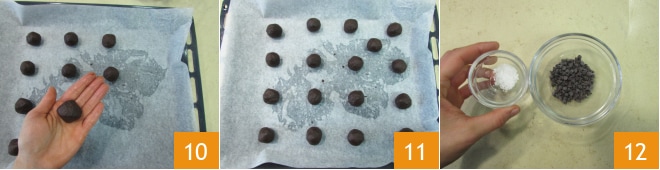 Prélevez environ 16/18 grammes de pâte, formez des petites boules avec les mains 10, en les façonnant rapidement pour ne pas trop chauffer la pâte, et posez-les sur une plaque tapissée de papier sulfurisé 11, vous obtiendrez environ 35 petits biscuits. Dans un petit bol, mélangez les pépites de chocolat avec les flocons de sel 12.