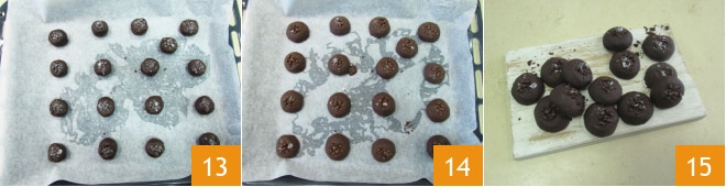Décorez la surface des petits biscuits avec le chocolat et la fleur de sel 13. Faites cuire dans un four statique préchauffé à 180 degrés pendant environ 18 minutes. Une fois cuits, sortez les petits biscuits au cacao sans œufs du four 14 et laissez-les tiédir avant de les déguster 15.