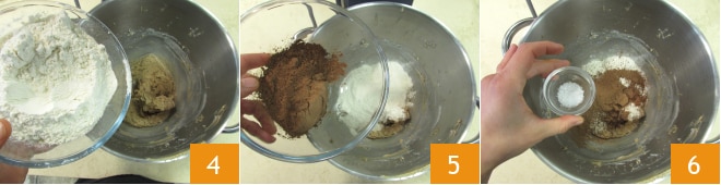 Incorporez la farine 4, le cacao 5 et les flocons de sel.