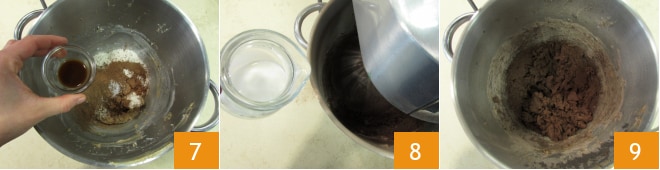 Aromatisez avec l'extrait de vanille 7 et mélangez encore avec les fouets. Pendant que le batteur est en marche, versez lentement le lait 8 et continuez jusqu'à absorption complète 9