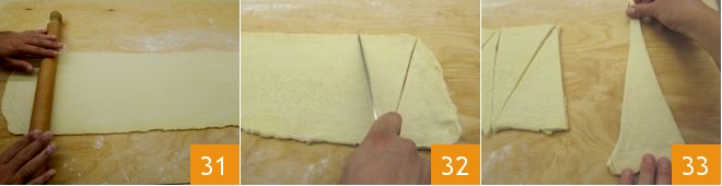 Enfin, reprenez le bloc et étalez-le à une épaisseur d'environ 2-3 mm pour obtenir un rectangle de 75 cm de large et 15 cm de long. Vous devrez en découper 15 triangles de 10 cm de base et 15 cm de hauteur 32. À ce stade, tenez fermement avec une main la base de l'un des triangles et avec l'autre main, allongez délicatement la pâte pour en augmenter la longueur de 1/4 33.