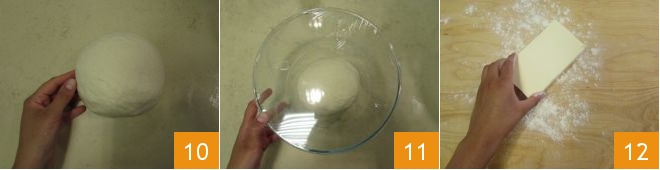 et boulez la pâte pour lui donner une forme sphérique 10. Transférez dans un bol, couvrez de film plastique 11 et laissez lever à température ambiante pendant 2 heures. Pendant ce temps, transférez le beurre sur un plan de travail fariné 12