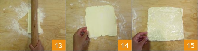 et en ajoutant un peu de farine, étalez-le avec un rouleau à pâtisserie 13 pour obtenir un carré de 20x20 cm d'épaisseur d'environ un demi-cm 14. Enveloppez ensuite dans du film alimentaire 15 et placez au réfrigérateur.
