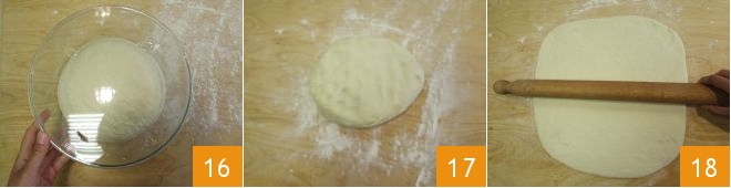 À la fin de la levée 16, transférez la pâte sur un plan de travail fariné 17 et toujours avec le rouleau à pâtisserie, étalez-la pour obtenir un carré de 30x30 cm 18.