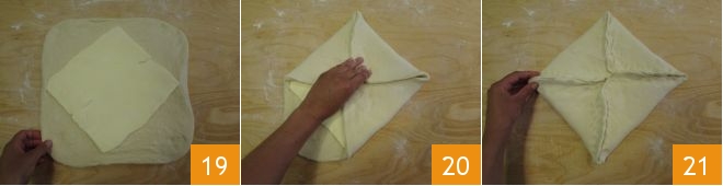 Placez ensuite le bloc de beurre au centre du carré pour former un losange 19. Repliez ensuite les extrémités de la pâte sous-jacente vers le centre du bloc de beurre 20, en joignant les bords mais sans les superposer. Scellez les extrémités avec les doigts 21. Laissez reposer au réfrigérateur pendant 10-15 minutes.