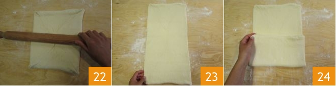 Placez à nouveau le carré obtenu sur un plan de travail légèrement fariné et étalez-le pour allonger un seul côté 22 jusqu'à obtenir un rectangle de 44 cm de long et d'une épaisseur d'un demi-cm. Faites ensuite le premier pliage à 3 en portant un bord de pâte à 1/3 du rectangle 24
