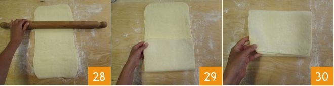 et recouvrez avec l'autre bord 25 : le premier pliage est prêt. Couvrez de film plastique et laissez reposer au moins 30 minutes au réfrigérateur. Reprenez le bloc et placez-le toujours sur le plan de travail fariné 26; étalez-le dans la direction des pliages 27