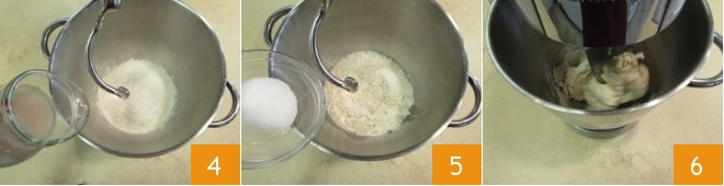 ajoutez ensuite la levure 4 et le sucre 5. Actionnez le robot jusqu'à obtenir une pâte homogène 6.