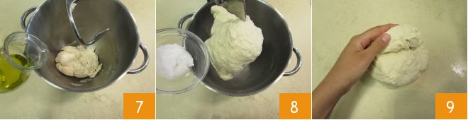 Ajoutez ensuite l'huile 7 et laissez-la s'incorporer jusqu'à ce que la pâte s'accroche au crochet. Enfin, ajoutez le sel 8 et travaillez encore quelques minutes jusqu'à ce qu'il soit absorbé 8. Transférez ensuite sur un plan de travail 9