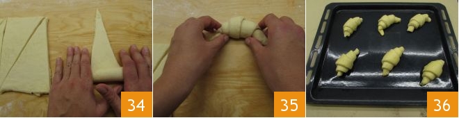 Il ne vous reste plus qu'à rouler votre croissant en partant de la base sans trop écraser ni serrer 34. Vous devrez obtenir 2 tours complets, donc 3 spires 35. Préparez ainsi tous les croissants et disposez-les au fur et à mesure sur une plaque de cuisson en les espaçant bien entre eux.