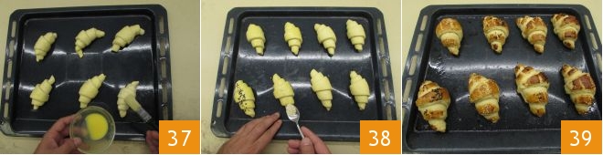 Badigeonnez la surface avec un jaune d'œuf battu 37 et décorez certains croissants avec des graines de sésame blanches et d'autres avec des graines de sésame noires 38. Laissez-les lever pendant une heure et demie à température ambiante. Enfournez dans un four ventilé préchauffé à 200° pendant 30 minutes, en vérifiant la cuisson sans ouvrir le four jusqu'à ce qu'ils soient bien dorés. Sortez du four 39 et laissez refroidir avant de les couper et de farcir vos croissants salés.