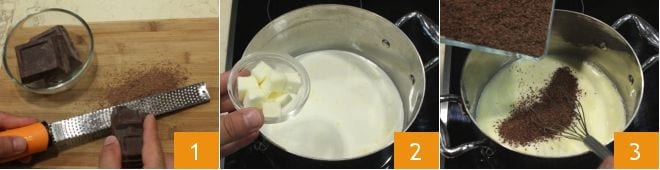 Pour réaliser les petits gâteaux à la crème aux deux chocolats, commencez par préparer la ganache au chocolat, cliquez Crème ganache pour consulter la fiche complète. Râpez le chocolat noir 2 ou coupez-le en éclats avec un couteau. Versez la crème dans une grande casserole, ajoutez le beurre 2 et portez presque à ébullition à feu doux ; lorsque la crème sera sur le point de bouillir, retirez la casserole du feu et ajoutez le chocolat noir râpé, en mélangeant avec un fouet 3