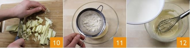 Maintenant, consacrez-vous à la crème claire, cliquez ici pour consulter la fiche de la Crème pâtissière au chocolat blanc : hachez le chocolat blanc en éclats avec un couteau 10 et réservez-le, versez dans un bol le lait concentré et ajoutez la farine tamisée 11. Faites tiédir le lait dans une casserole à feu doux, puis ajoutez-le en filet au mélange de farine et de lait concentré en mélangeant avec un fouet pour éviter la formation de grumeaux 12.