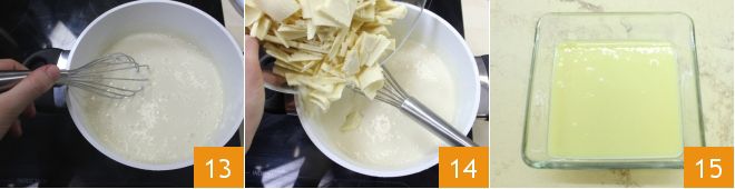 Transférez le mélange dans une casserole et faites-le épaissir à feu doux, en mélangeant continuellement avec le fouet 13. Enfin, ajoutez le chocolat blanc coupé en éclats 14 et continuez la cuisson jusqu'à ce qu'il soit complètement fondu. La crème pâtissière au chocolat blanc sera prête lorsqu'elle sera bien épaissie, cela prendra environ 15-20 minutes : transférez-la dans un récipient large et bas 15,