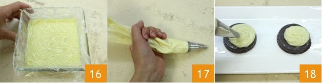 couvrez-la avec le film plastique au contact 16 et, une fois à température ambiante, placez-la au réfrigérateur pour refroidir. Reprenez la crème froide et versez-la dans une poche à douille munie d'une douille étoilée 17, garnissez la surface des petits gâteaux au chocolat noir 18 comme vous l'avez fait précédemment. Vos petits gâteaux à la crème aux deux chocolats sont prêts, garnissez-les d'éclats de chocolat et dégustez-les !