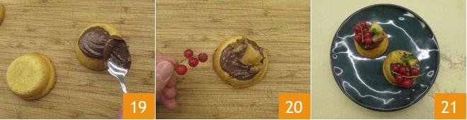Garnissez chaque petit gâteau avec 15 g de Nutella® 19, en l'étalant avec une petite cuillère. Ajoutez un peu de la garniture restante et une branche de groseille 20 et une feuille de menthe. Les petits gâteaux de pandoro avec pommes, noix et Nutella® sont prêts à être dégustés 21.