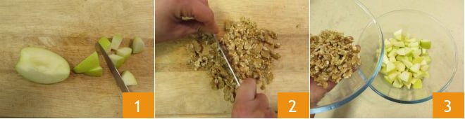 Pour réaliser les petits gâteaux de pandoro avec pommes, noix et Nutella®, faites fondre le beurre à feu très doux et laissez tiédir. Lavez et séchez les pommes, coupez-les en deux, retirez le trognon et réduisez-les en petits cubes réguliers sans les éplucher 1. Hachez grossièrement les noix 2 et versez-les dans un bol avec les pommes 3.