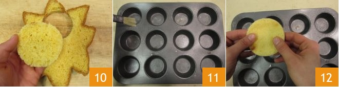 12 disques serviront pour le fond des petits gâteaux et les 12 autres pour la couverture 10. Badigeonnez avec la moitié du beurre fondu les espaces d'un moule à muffins 11. Tapissez-les avec autant de disques, en les faisant bien adhérer au fond et sur les bords 12.