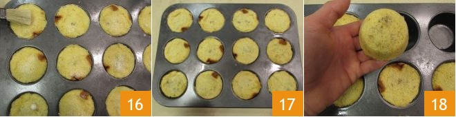 Badigeonnez la surface avec le reste de beurre fondu 16 et enfournez à nouveau à 200° pendant 8 à 10 minutes. Une fois ce temps écoulé, sortez les petits gâteaux du four 17, laissez-les tiédir puis démoulez-les 18 en les retournant sur une planche.