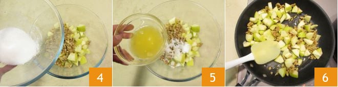 Assaisonnez ensuite avec le sucre 4 et le jus d’orange 5. Faites sauter les pommes à feu moyen-vif pendant quelques minutes en remuant souvent 6.