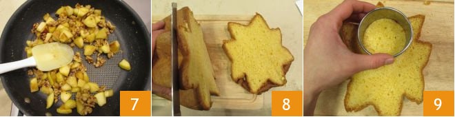 Faites-les griller dans un four préchauffé à 200° pendant 5 minutes 13. Garnissez-les avec les pommes caramélisées 14 et refermez avec un autre disque de pandoro 15.