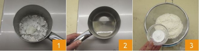 Pour préparer les petites gâteaux noix de coco et fruits rouges, commencez par mettre l'huile de coco dans une petite casserole 1 et faites-la fondre à feu doux juste le temps de la rendre liquide 2. Pendant ce temps, tamisez la farine et la levure dans un autre bol 3.