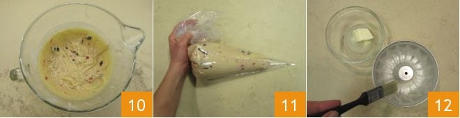 Après avoir incorporé les fruits rouges dans la pâte 10, transférez-la dans une poche à douille 11 et occupez-vous de beurrer 12 et de fariner 5 moules en forme de couronne de 12 cm de diamètre et 4 cm de hauteur.