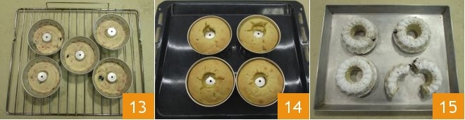 Remplissez les moules avec la pâte jusqu'à mi-hauteur 13, puis faites cuire dans un four statique préchauffé à 180° pendant environ 25 minutes, en les plaçant sur la grille du milieu. Une fois cuits, sortez les petites gâteaux du four 14 et laissez-les refroidir, puis démoulez-les. Servez vos délicieuses petites gâteaux noix de coco et fruits rouges saupoudrées de beaucoup de sucre glace 15 !