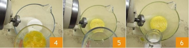 Ensuite, versez le sucre dans le bol d'un robot équipé d'une feuille, ajoutez les œufs 4 et travaillez à basse vitesse jusqu'à obtenir un mélange clair et mousseux. Ensuite, arrêtez le robot, ajoutez l'huile de coco 5, travaillez encore et, après quelques minutes, ajoutez également le lait de coco 6.