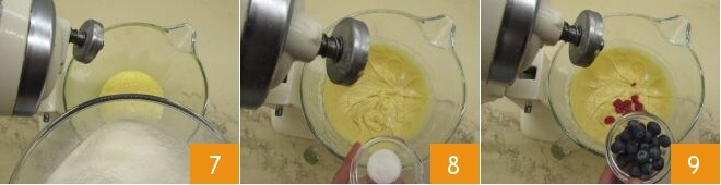 Lorsque le mélange devient homogène, arrêtez à nouveau la machine, versez la farine tamisée avec la levure 7 et continuez à travailler jusqu'à ce que les poudres soient bien incorporées. Enfin, ajoutez le sel 8, les framboises et les myrtilles 9 et mélangez à nouveau.