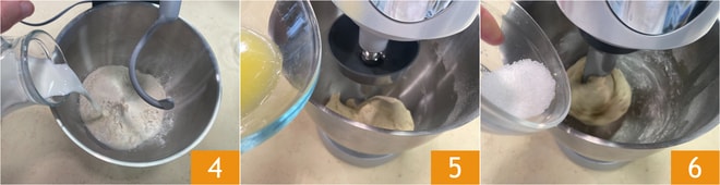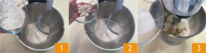 Pour préparer les petits pains au lait, commencez par mettre dans un robot pâtissier la farine manitoba, ajoutez la farine T55 1, la levure émiettée 2 et le sucre 3.