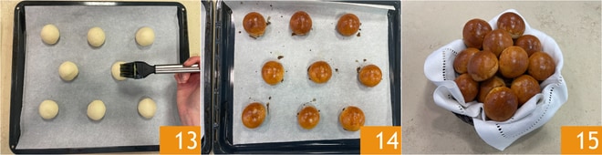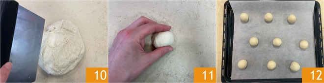 Divisez la pâte 10 en 30 petits morceaux de 30 g chacun. Pour chacun de ces morceaux, prenez les bords et ramenez-les au centre de la pâte, puis formez une boule 11 et pincez légèrement la base pour sceller la fermeture. Au fur et à mesure que vous les faites, disposez les petits pains, légèrement espacés les uns des autres, sur des plaques de cuisson recouvertes de papier sulfurisé 12, et laissez lever 30 minutes.