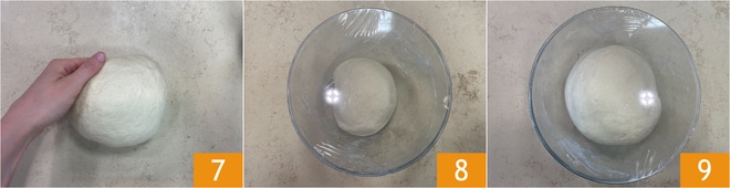 Une fois le sel absorbé, transférez la pâte sur le plan de travail, travaillez-la juste assez pour lui donner une forme sphérique 7, puis placez-la dans un bol et couvrez de film alimentaire 8. Laissez lever dans un endroit sec à l'abri des courants d'air pendant environ 2 heures ou jusqu'à ce que le volume double 9.