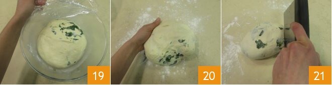 Après le temps de levée 19, transférez la pâte sur un plan légèrement fariné 20 et découpez 8 morceaux de 100-110 g 21.