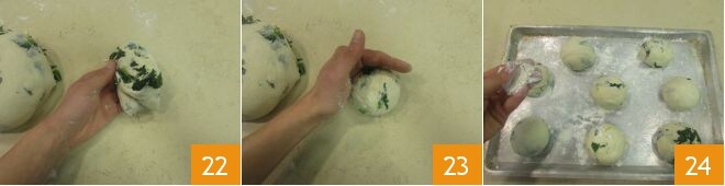 Donnez à chaque portion une forme de boule 22, puis faites rouler la pâte sur un plan 23 et placez-les au fur et à mesure sur une plaque. À ce stade, saupoudrez légèrement la surface de farine 24