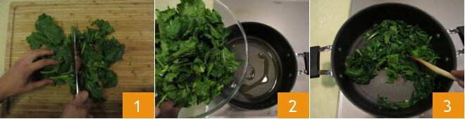 Pour préparer les petits pains aux feuilles de navet, commencez par laver les feuilles de navet, puis coupez-les en morceaux avec un couteau 1. Faites chauffer un filet d'huile dans une casserole, ajoutez les feuilles de navet 2 et faites-les cuire en remuant de temps en temps 3