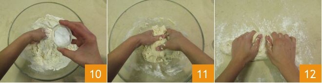 et commencez à pétrir. Avant qu'elle ne soit complètement absorbée, ajoutez également le sel 10. Continuez à travailler le mélange 11, puis transférez-le sur un plan fariné et pétrissez jusqu'à obtenir une pâte homogène 12.