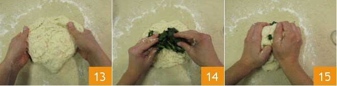 À ce stade, étalez la pâte 13 et placez les feuilles de navet bien froides au centre 14. Pétrissez avec les mains pour les incorporer à la pâte 15, en ajoutant plus de farine si elle est trop humide.