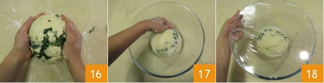 Travaillez la pâte encore 5 minutes, puis formez une boule 16 et placez-la dans un bol 17. Couvrez avec du film alimentaire 18 et laissez lever pendant au moins 3 heures, jusqu'à ce qu'elle ait doublé de volume.