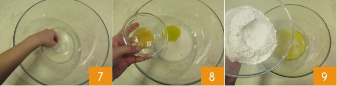mélangez avec les mains ou une cuillère pour la dissoudre complètement 7. Ajoutez l'huile et le miel 8, puis incorporez progressivement la farine 9