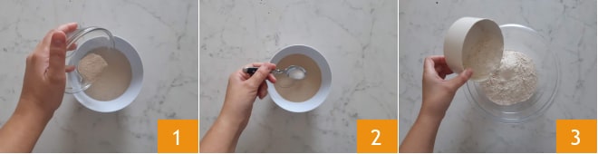 Pour préparer les petits pains complets aux pignons, commencez par verser la levure dans l'eau tiède 1 et ajoutez le sucre 2. Mélangez le tout avec une cuillère pour dissoudre la levure et le sucre. Dans un grand bol, mettez la farine complète et la farine 00 3, mélangez les deux farines avec une cuillère.