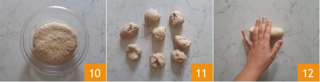 Une fois levée, reprenez la pâte 10, divisez-la en 8 morceaux de 50 g 11. Travaillez chaque morceau de pâte avec vos mains pour obtenir un rouleau 12,