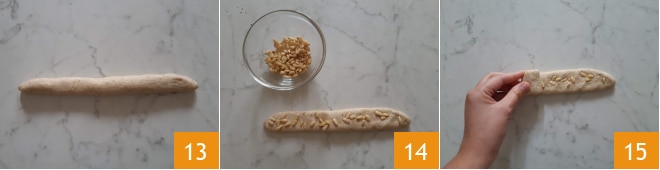 aplatissez-le avec les doigts 13 et mettez les pignons dessus 14. Roulez-le 15