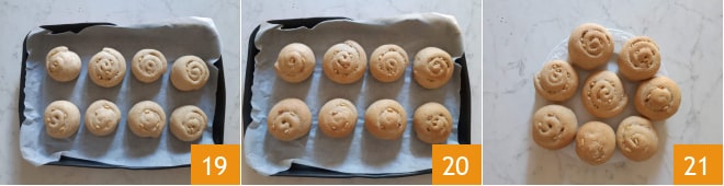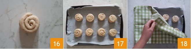 de manière à former des spirales de pain 16. Répétez l'opération pour tous les morceaux et au fur et à mesure, transférez-les sur une plaque de cuisson recouverte de papier sulfurisé 17. Couvrez avec un torchon 18 et laissez lever les petits pains pendant une autre demi-heure.