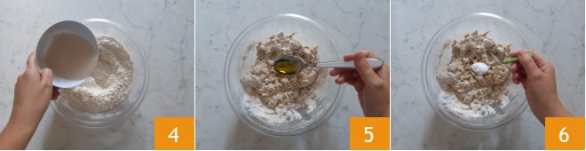 Versez dans le bol l'eau avec la levure dissoute 4 et commencez à pétrir avec les mains. Tout en pétrissant, ajoutez la cuillère d'huile 5 et enfin le sel 6.