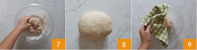Pétrissez encore, puis transférez la pâte sur la table et continuez à pétrir ici jusqu'à obtenir une belle boule de pâte élastique et homogène 8. Mettez la pâte obtenue dans un bol fariné, couvrez avec un torchon humide 9 et laissez lever pendant environ 2 heures, la pâte doit doubler de volume.